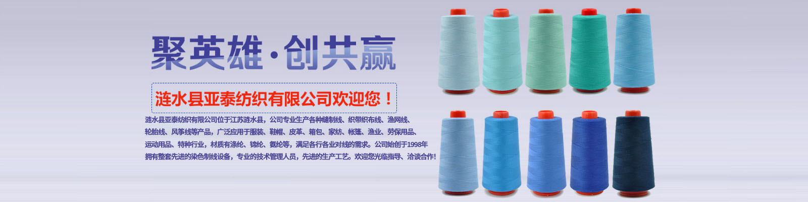 漣水縣亞泰紡織有限公司位于江蘇漣水縣,公司專業(yè)生產(chǎn)各種縫制線、織帶織布線、漁網(wǎng)線、輪胎線、風箏線等產(chǎn)品,廣泛應(yīng)用于服裝、鞋帽、皮革、箱包、家紡、帳篷、漁業(yè)、勞保用品、運動用品、特種行業(yè),材質(zhì)有滌綸、錦綸、氨綸等,滿足各行各業(yè)對線的需求。公司始創(chuàng)于1998年,擁有整套先進的染色制線設(shè)備,專業(yè)的技術(shù)管理人員,先進的生產(chǎn)工藝。歡迎您光臨指導、洽談合作!